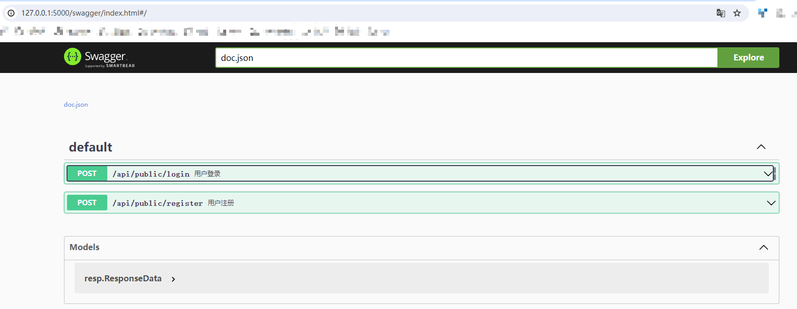 1 2 3 4 5 6 7 8 9 10 11 12 13 14 15 16 17 18 19 20 21 22 func initGin () { router := gin.Default() router.GET("/swagger/*any" , ginSwagger.WrapHandler(swaggerFiles.Handler)) apiPublic := router.Group("/api/public" ) { apiPublic.POST("/register" , service.Register) apiPublic.POST("/login" , service.Login) } err := router.Run(":5000" ) if err != nil { return } }